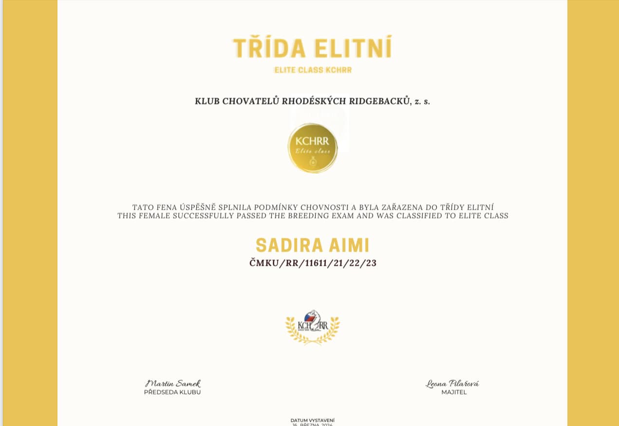 Díky tréningu a tomu jaká Aimi je, zvládla bonitaci pod KCHRR s vedením Šárky Štusákové na jedničku s hvězdičkou a byla zařazena do TŘÍDY ELITNÍ s nádherným posudkem. Junior champión.